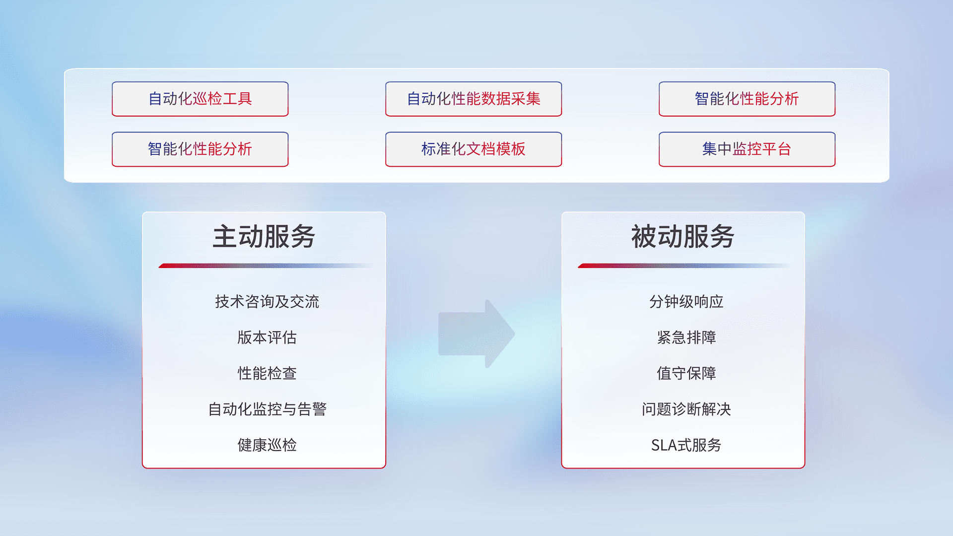 智能化工具和标准化文档,,,保障服务质量,,,提供主动服务(包含技术咨询、、、、版本评估、、性能检查、、、自动化监控与告警、、、健康巡检)和被动服务包含(分钟级响应、、、、紧急排障、、、、值守保障、、、、问题诊断解决、、、SLA服务)。。
